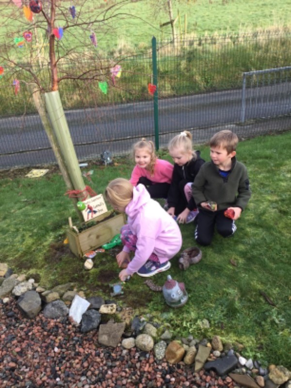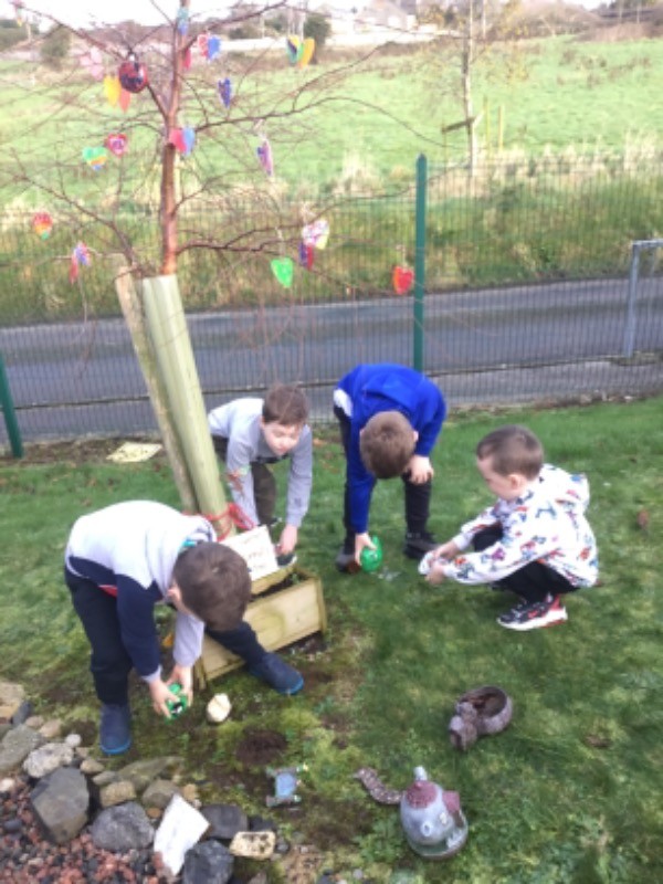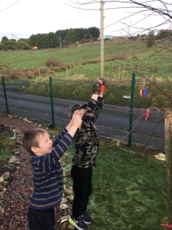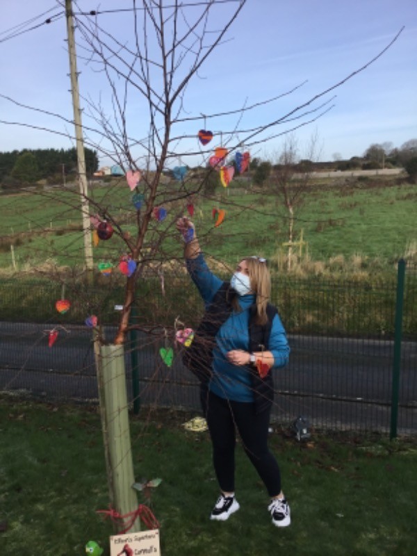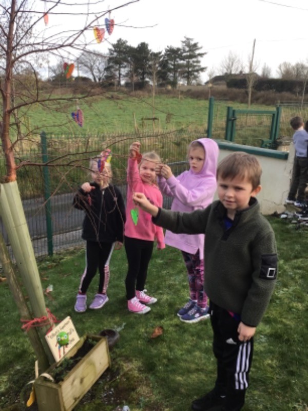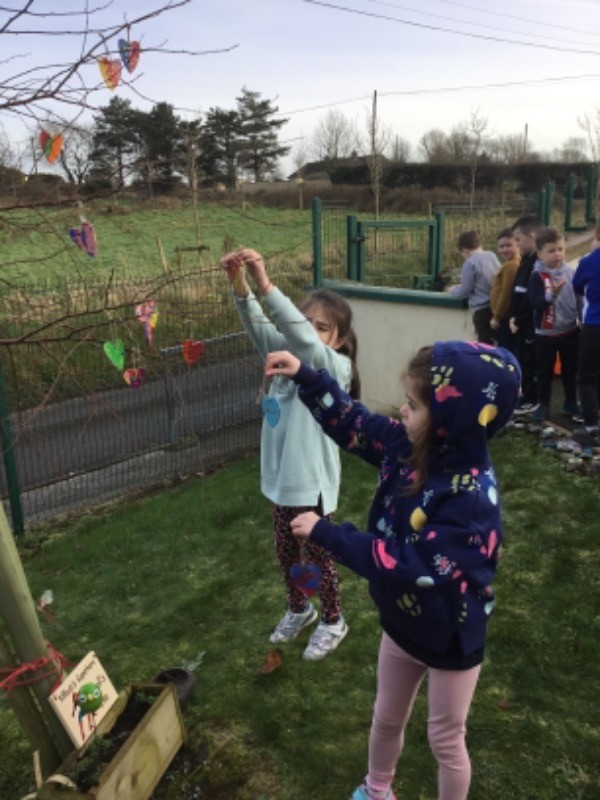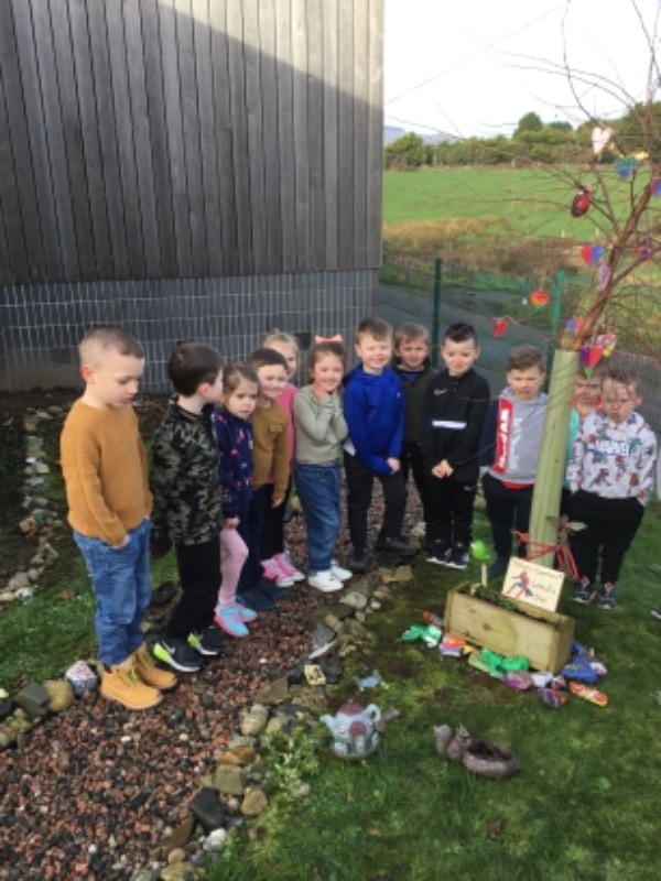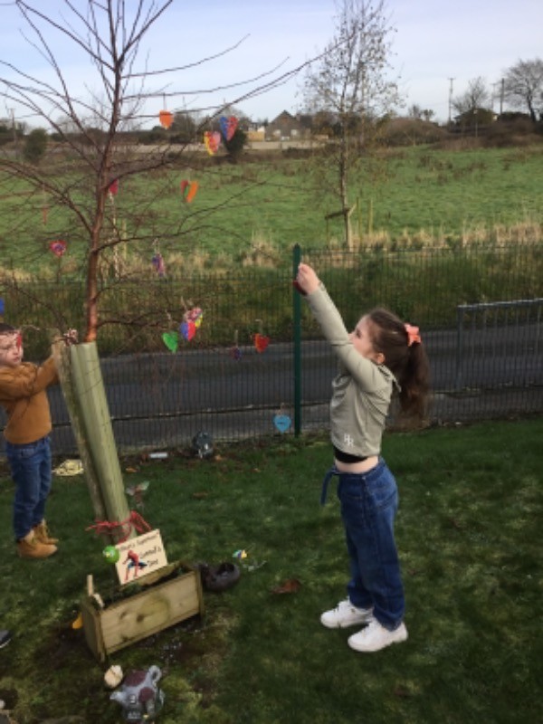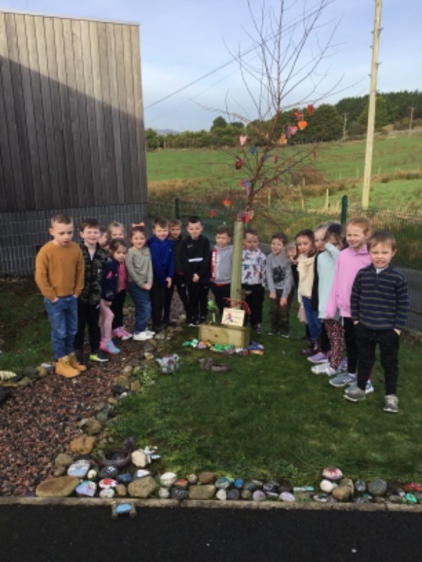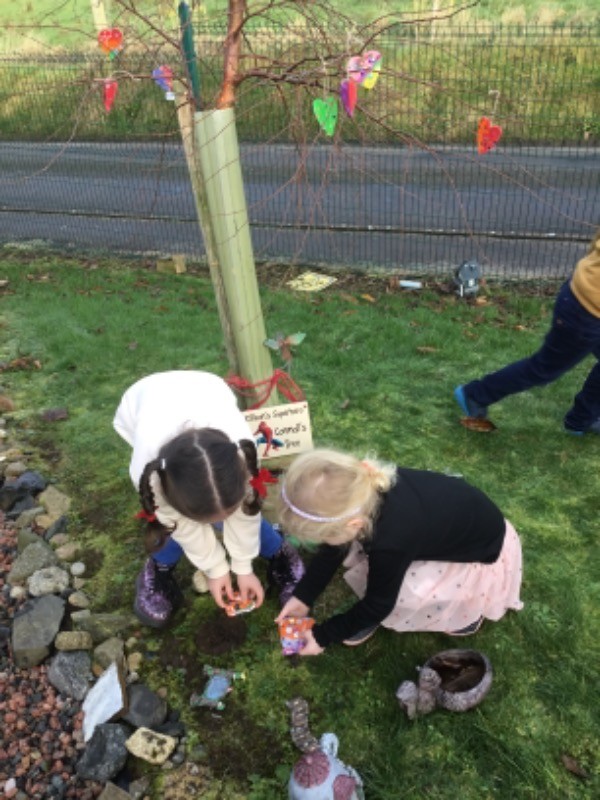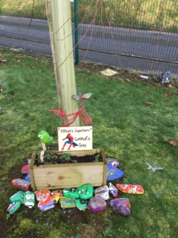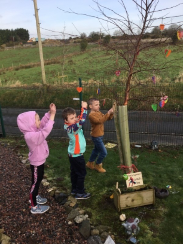 Primary 2/3 had carefully painted and decorated hearts in memory of our much loved and missed pupil Connall Magee. Each pupil and teacher placed a heart on the tree outside the P2/3 classroom which we have chosen to be Connall’s tree. Connall will always be part of our class and forever in our hearts.