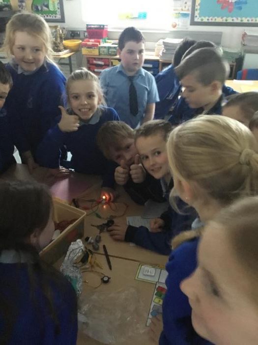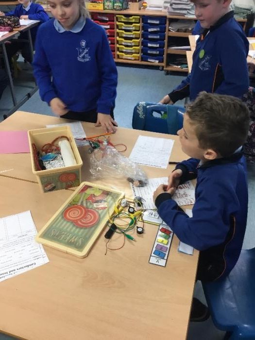 P4/5 love taking part in Science experiments. Today they were testing whether certain materials were conductors or insulators of electricity. They worked in groups and made their predictions first and then tested it out. They then recorded their findings in their World Around us books. Thanks to Jack Jennings for bringing in all the equipment and acting as our scientist with his assistants Aaron and Kara.